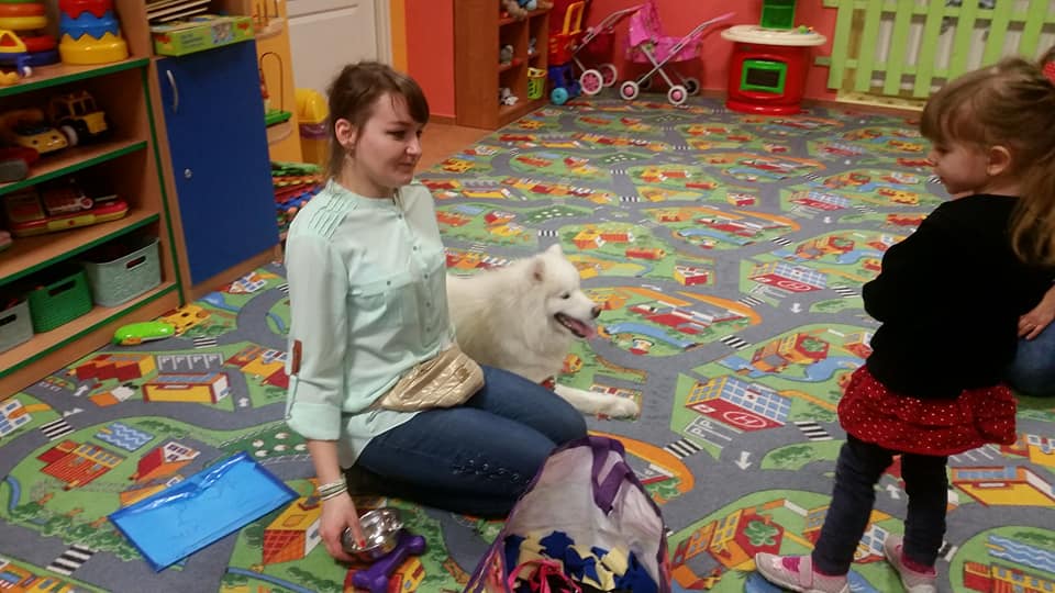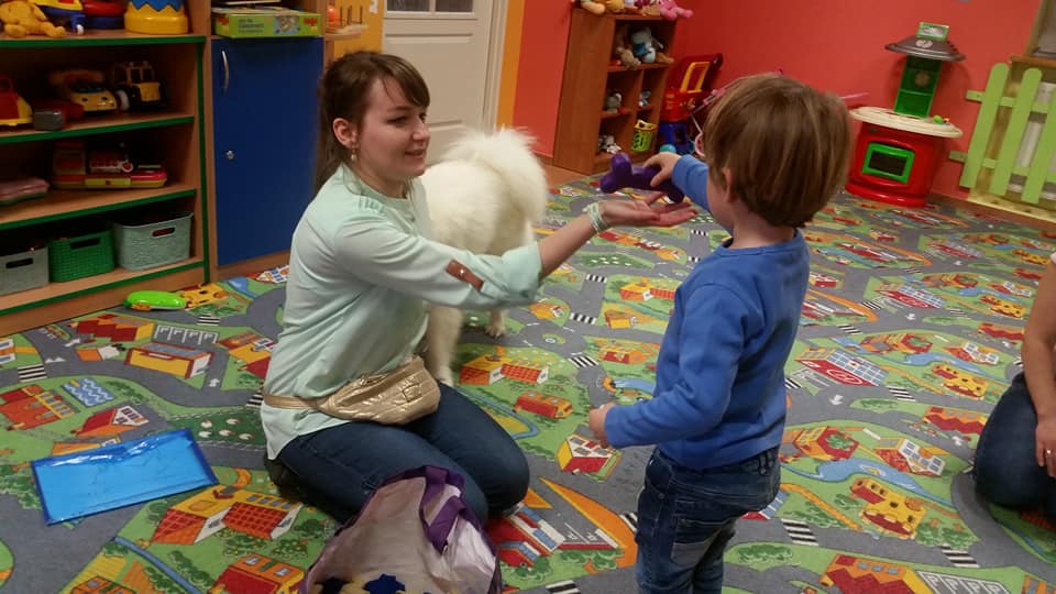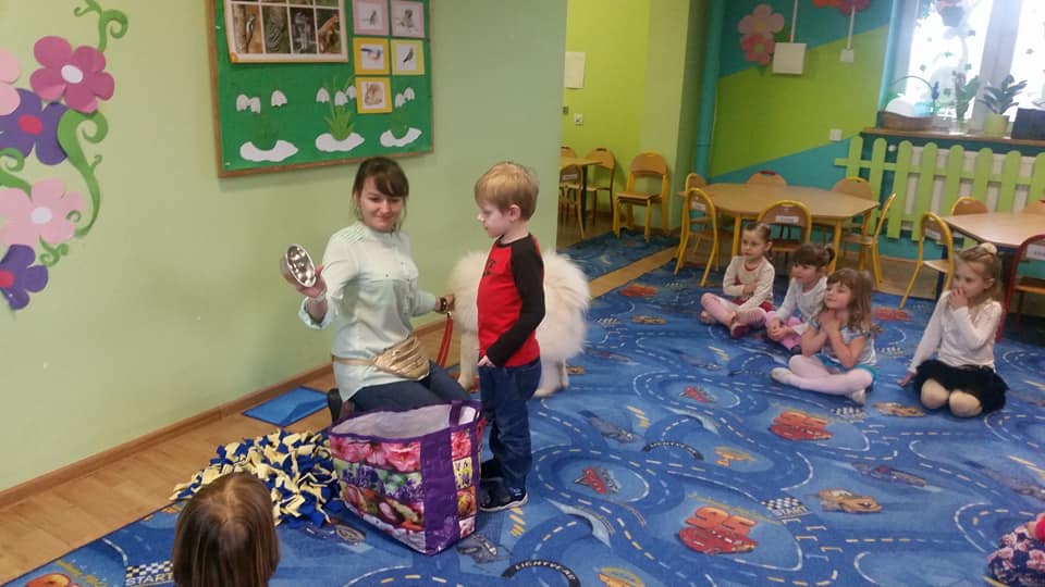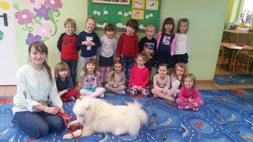 Dnia 9 marca 2018 r. przedszkolaków odwiedził specjalny gość – piesek Śnieżka wraz ze swoją opiekunką Panią Pauliną Buszko. W czasie spotkania dzieci miały okazję dowiedzieć się jaką rolę odgrywa pies w społeczeństwie. Uczyły się jak bezpiecznie i odpowiedzialnie postępować z psem . Śnieżka zaprezentowała kilka sztuczek: szczekanie na komendę, podskakiwanie, proszenie o karmę. Dzieci miały okazję przełamać lęk przed czworonogami i pogłębić kontakt przez podejście do psa. Bezpośredni kontakt ze zwierzętami przełamuje lęk, nieśmiałość , buduje poczucie bezpieczeństwa . Zajęcia te dostarczyły dzieciom wiele pozytywnej energii. Bardzo miło będziemy wspominać to spotkanie.